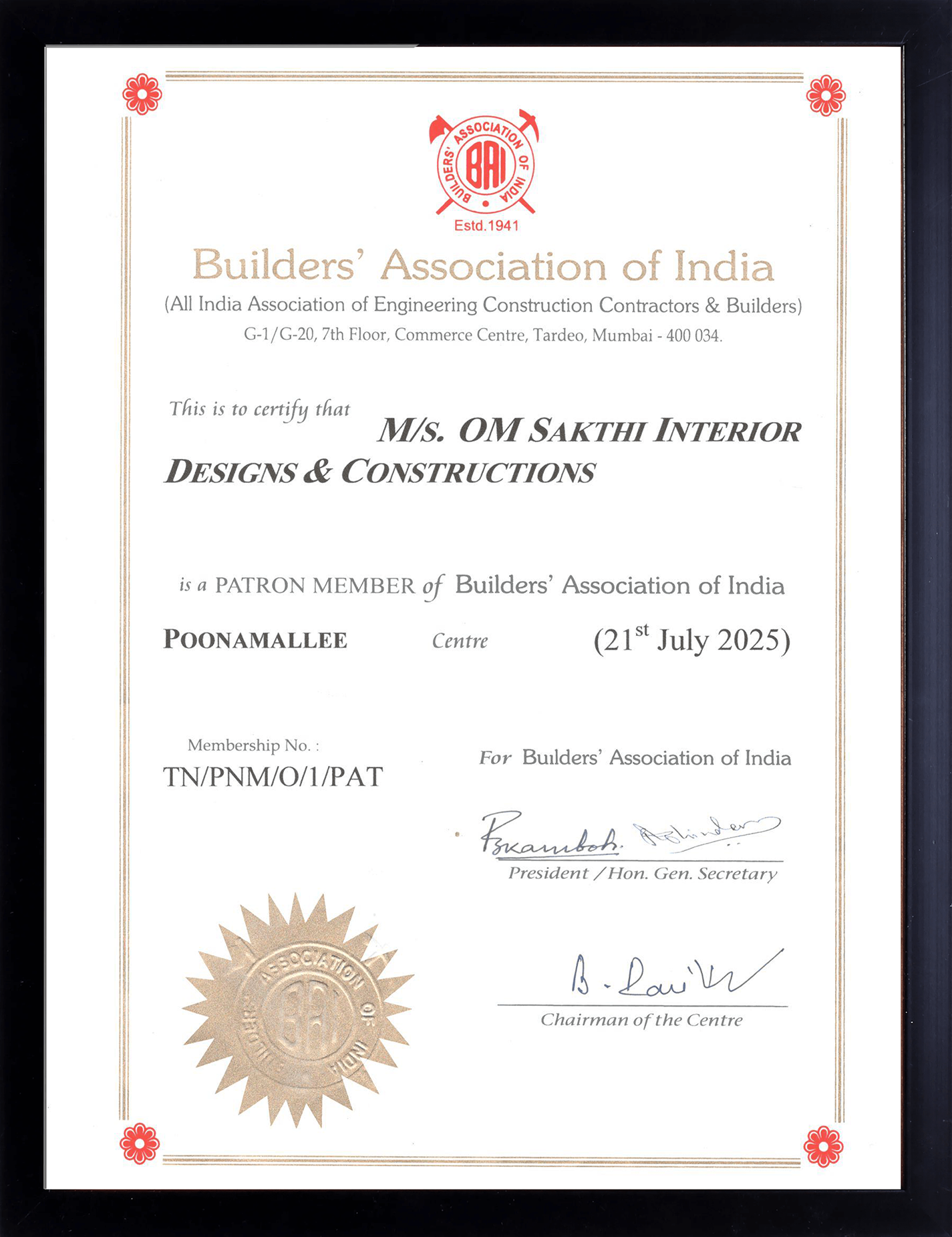 Established in the year 1995, Om Sakthi Interior Designs & Constructions in Chennai. The company was started under the headship of mentor “Mr. M. Shanmugam”, we have achieved massive victory in this sector. It was Running by Mr. S. Sakthibabbu is a top player in the category Building Contractors in the Chennai. This well-known establishment acts as a one-stop destination servicing customers both local and from other parts of Chennai. Over the course of its journey, this business has established a firm foothold in it’s industry. This business employs individuals that are dedicated towards their respective roles and put in a lot of effort to achieve the common vision and larger goals of the company. In the near future, this business aims to expand its line of products and services and cater to a larger client base.
